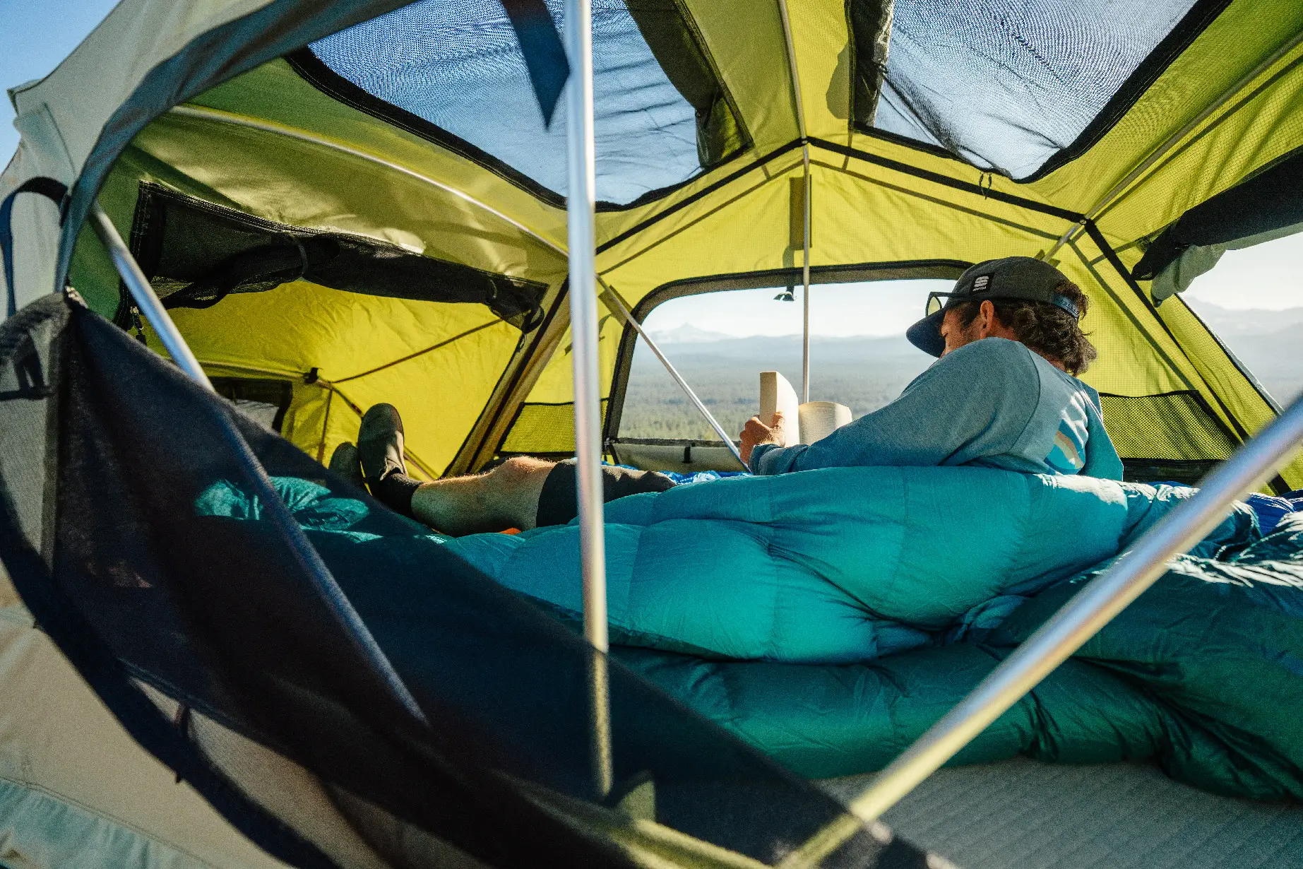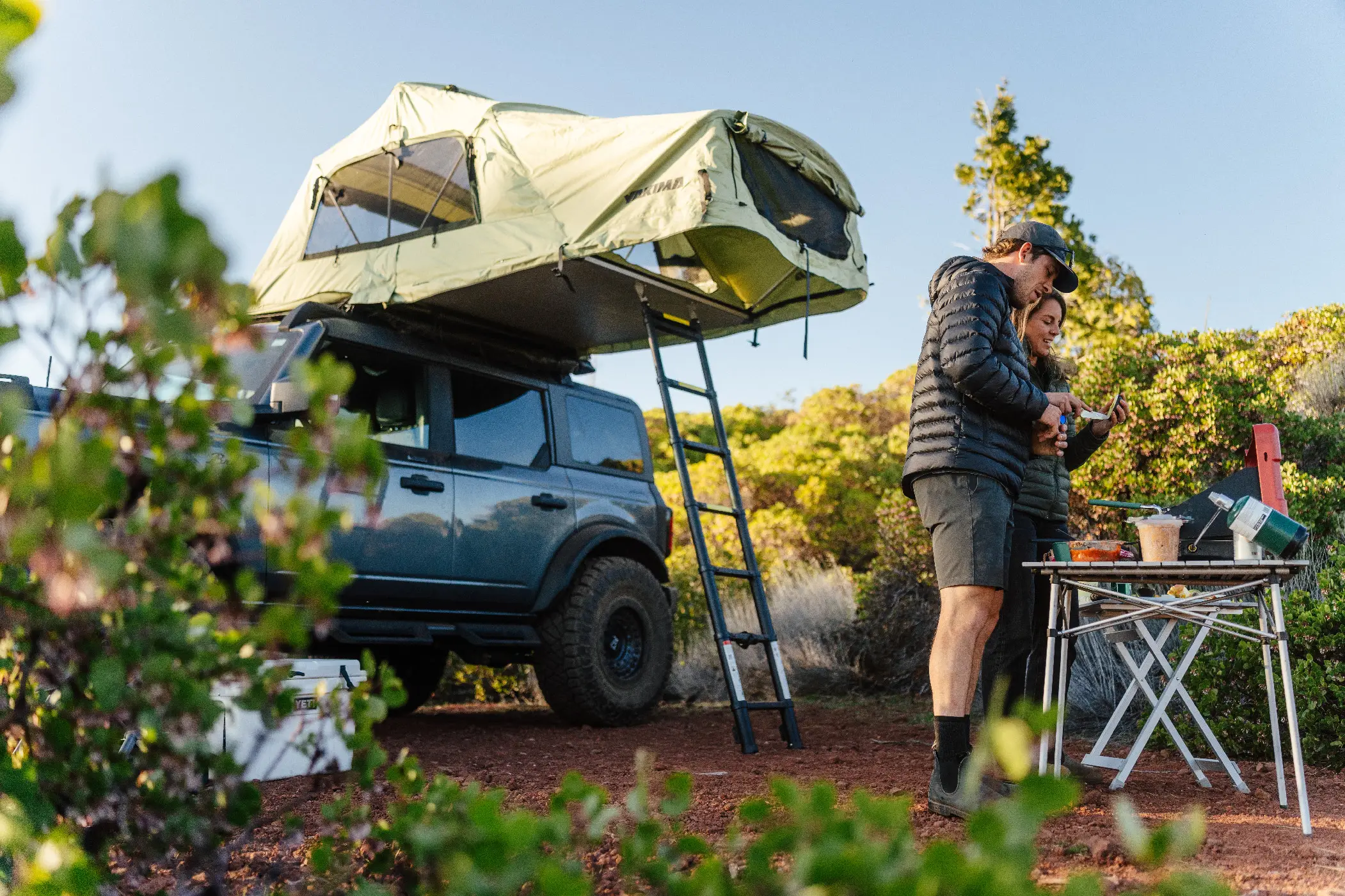 Rychle rozložitelný softshellový autostan Yakima SkyRise HD MD Green pro 2 osoby s prodlouženou přední částí pro krytý vstup po žebříku.