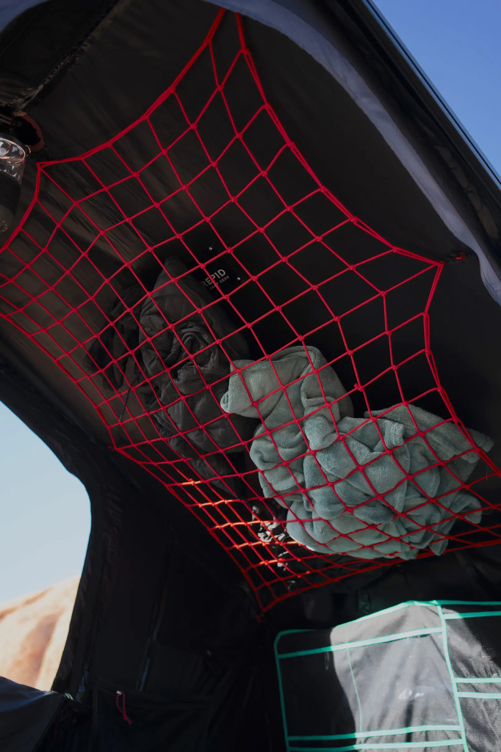 Elastická síť do stanu poskytuje dodatečný úložný prostor nad hlavou. Je ideální pro uložení větších předmětů, jako jsou přikrývky, polštáře nebo oblečení. Vytváří praktický úložný prostor v stanu bez zabírání místa na podlaze.