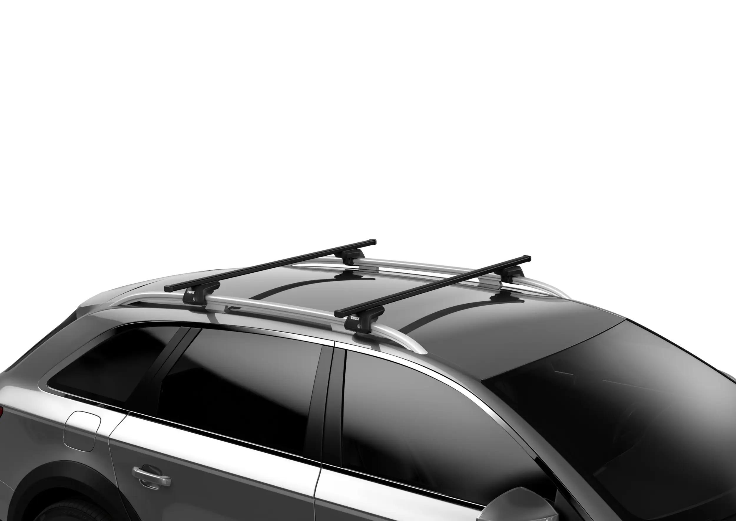 Kompletní střešní nosiče Thule SquareBar s rychlou a snadnou montáží, určené pro vozy se zvýšenými střešními podélníky. Balení obsahuje 4 patky a 2 tyče SquareBar.